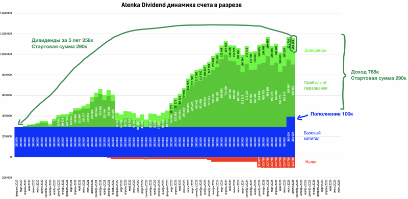 Хотя на Alenka Dividend дивиденды не самоцель, тем не менее за счёт роста счета и увеличения количества акций в шутках, за 5 лет совокупные дивиденды + купоны от облигаций практически сравнялись со стартовым капиталом.