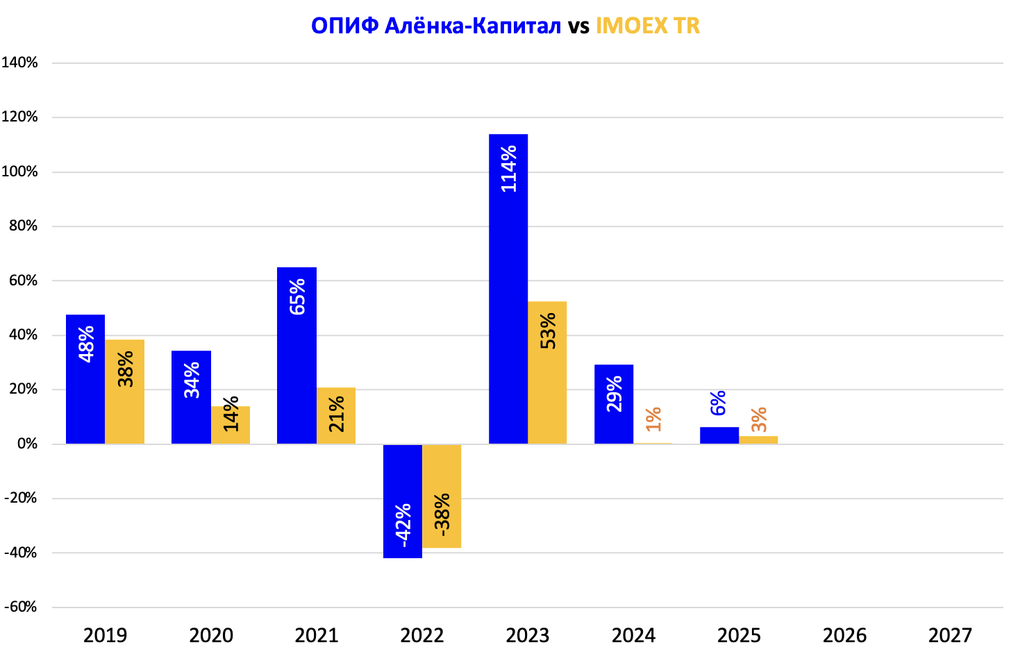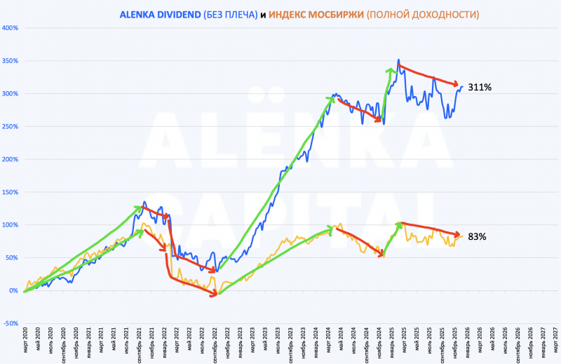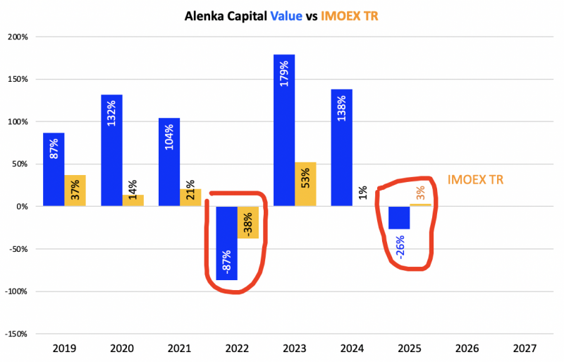 Получается основной отрыв от индекса с 2019 по 2025 годы формировался на бычьем рынке, а период кризиса главное было пройти потерь или с небольшим ущербом.