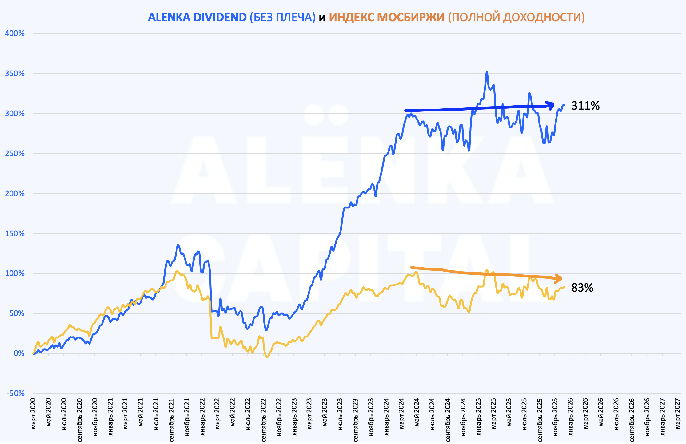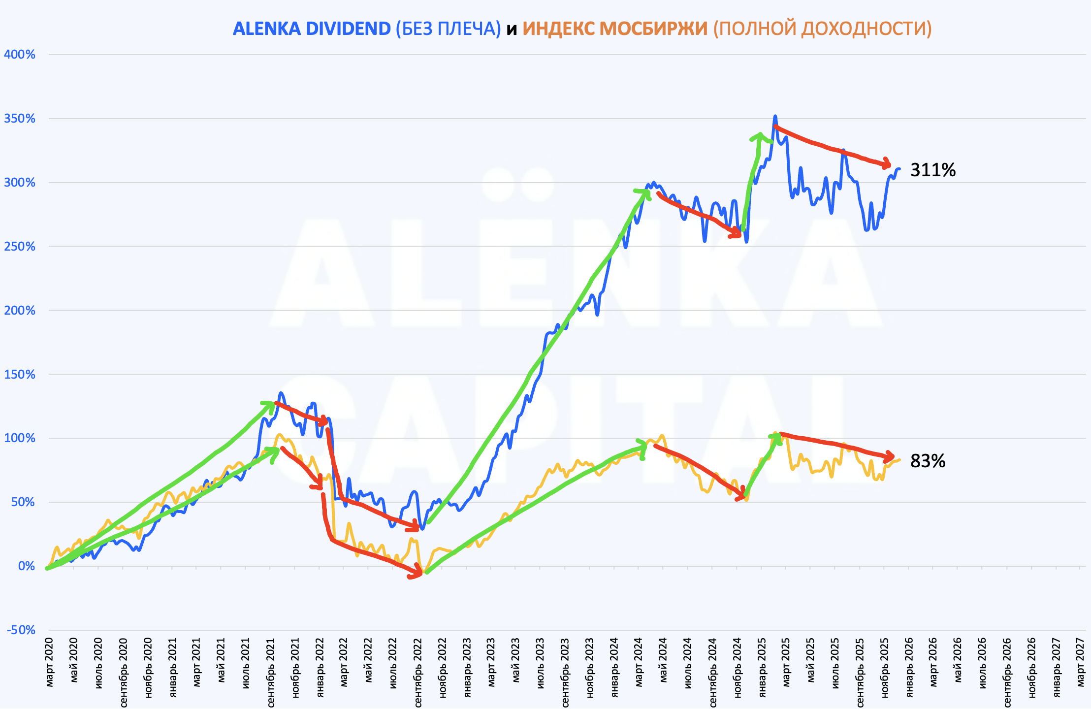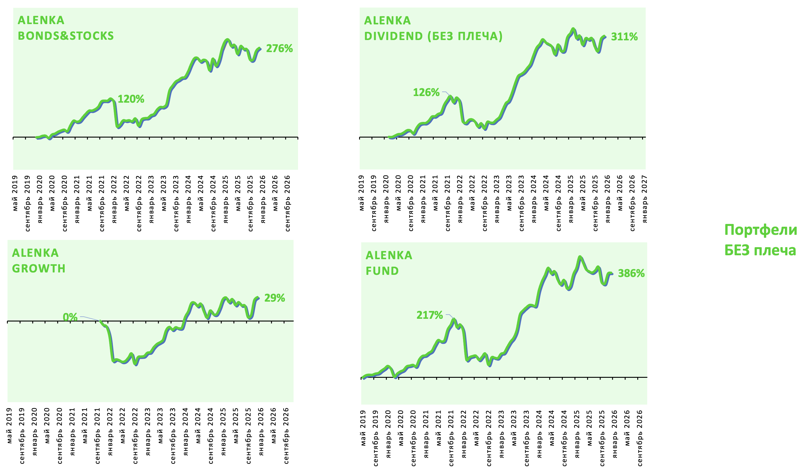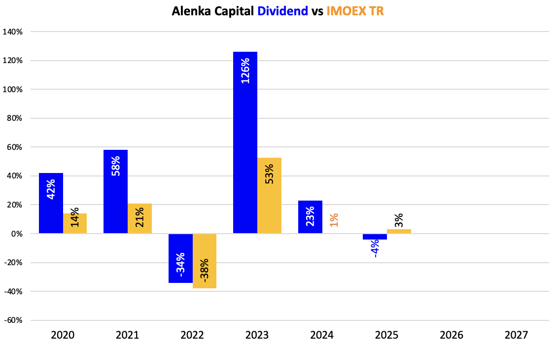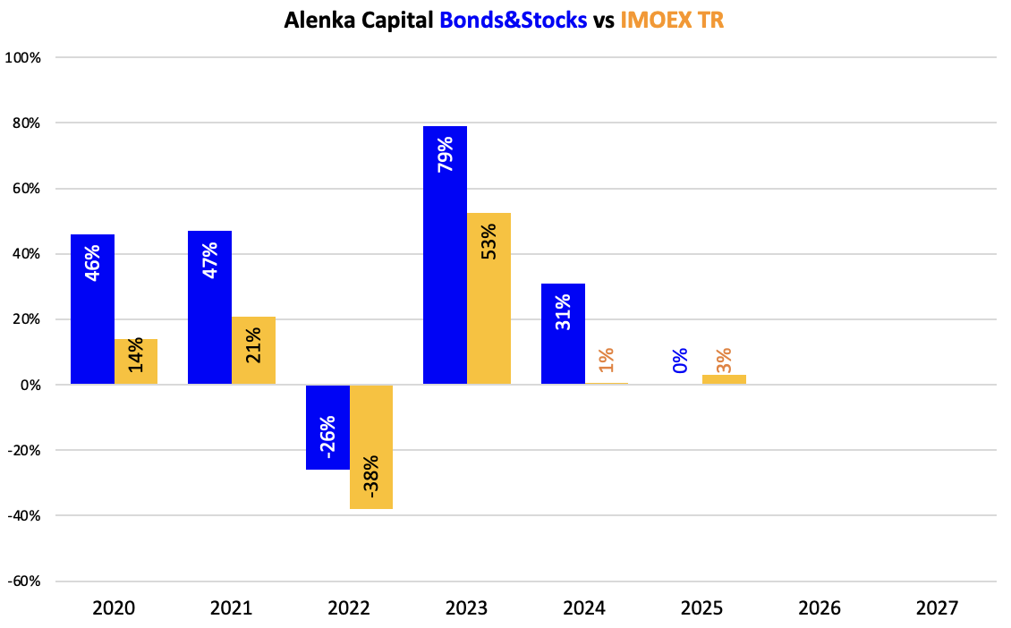Предыдущие 5 лет Alenka Dividend и Bonds&Stocks были лучше рынка на любых фазах - снижение (2022), рост (2020,2021,2023), флэт (2024).