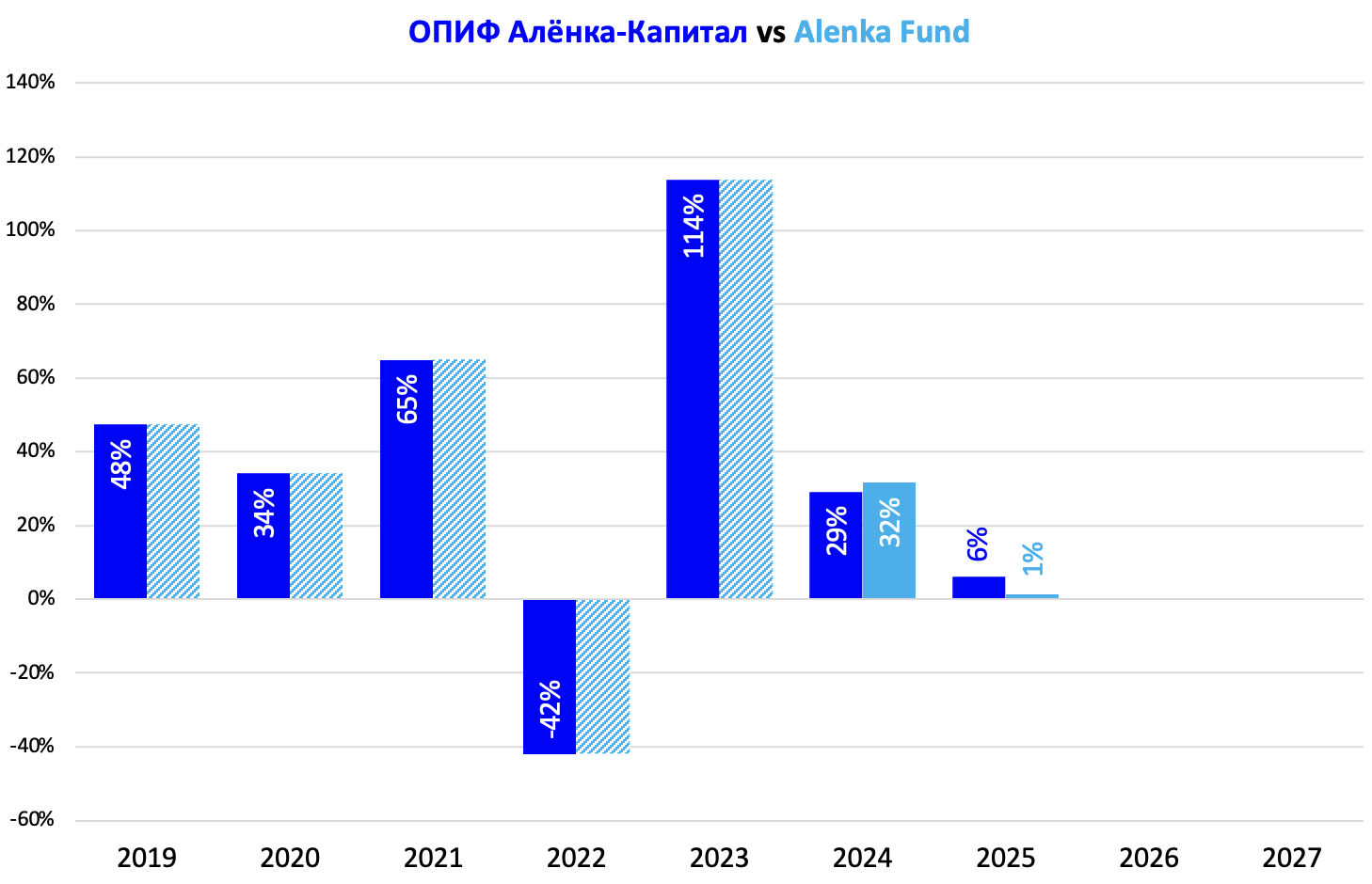 Alenka Fund, которая максимально приближена к составу ПИФа (на автоследовании доступны не все инструменты), в этом году немного хуже эталона.