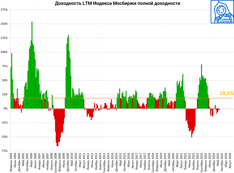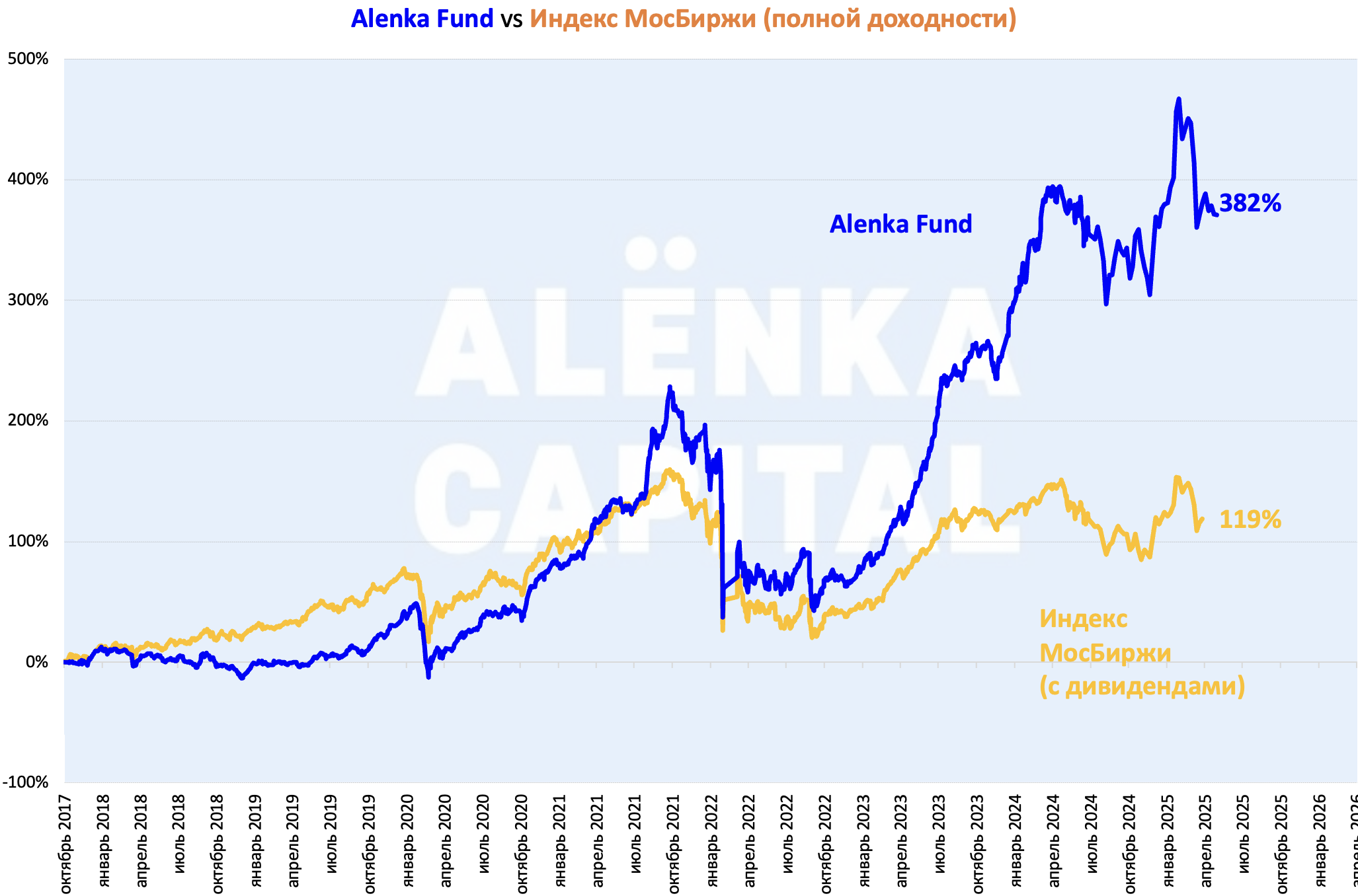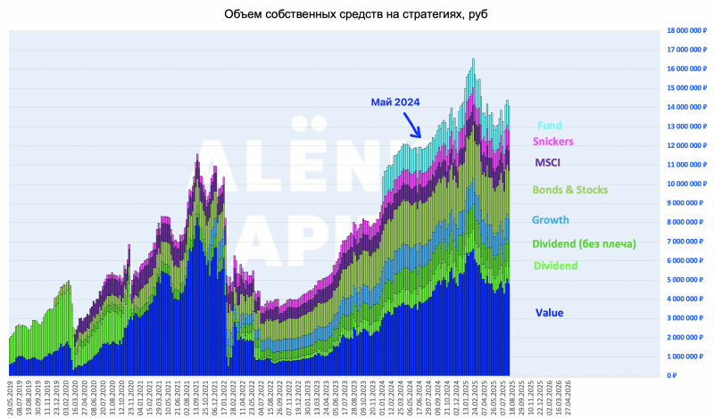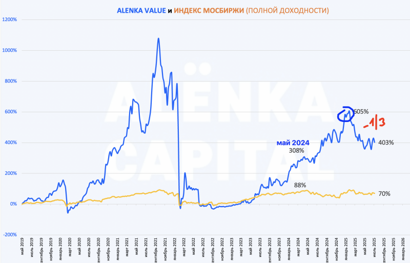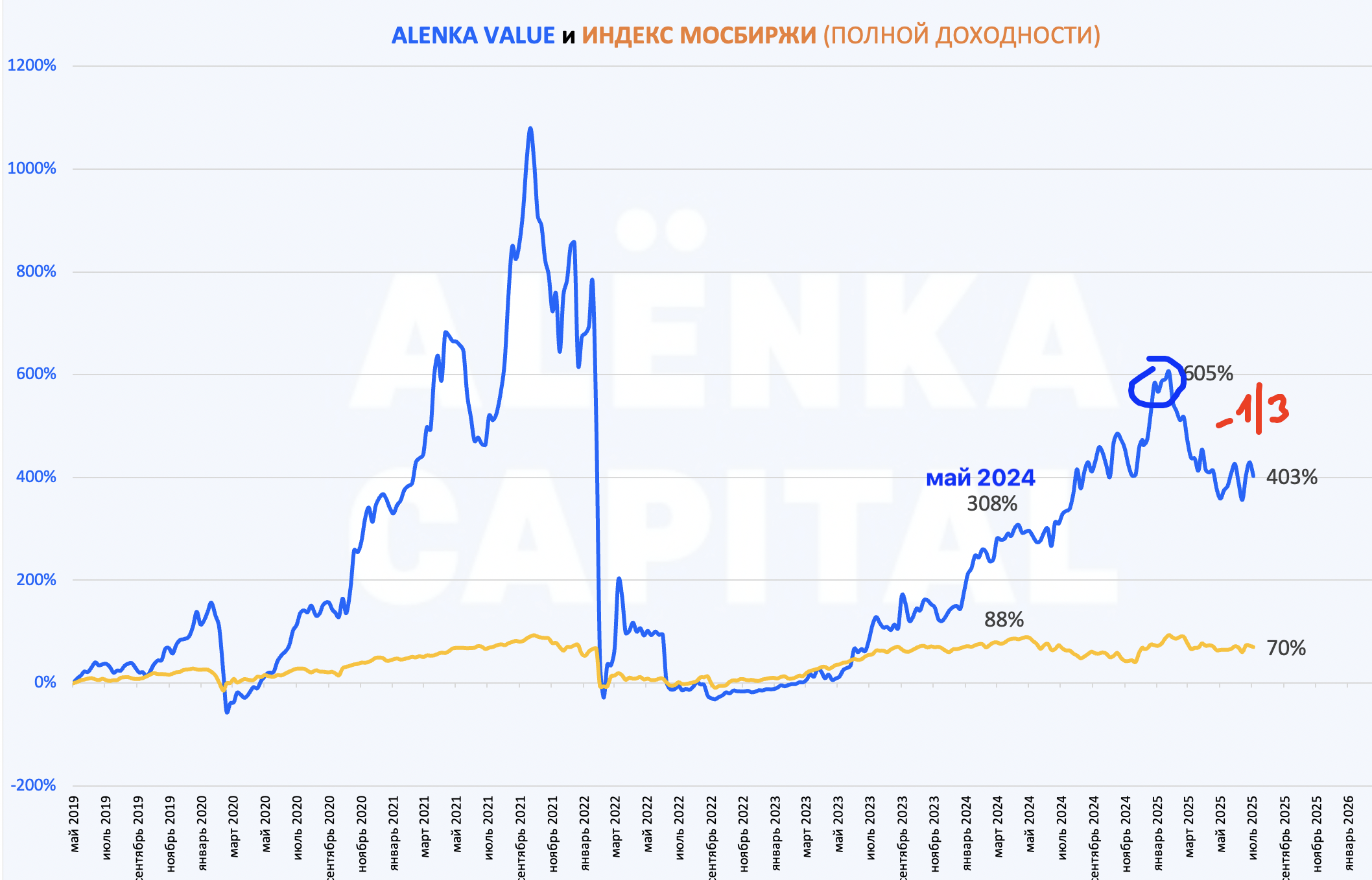 Но кто-то мог подключиться на самом пике в феврале 2025 после трёх лет роста и получить -30% на Alenka Value.