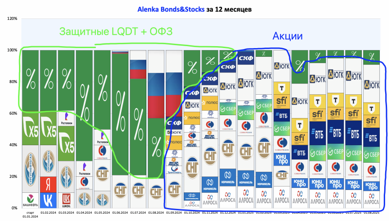 Если бы осенью 2024 года не перешли в акции, а остались бы в смешанном портфеле облигации+акции, то результат сегодня был бы примерно такой же.