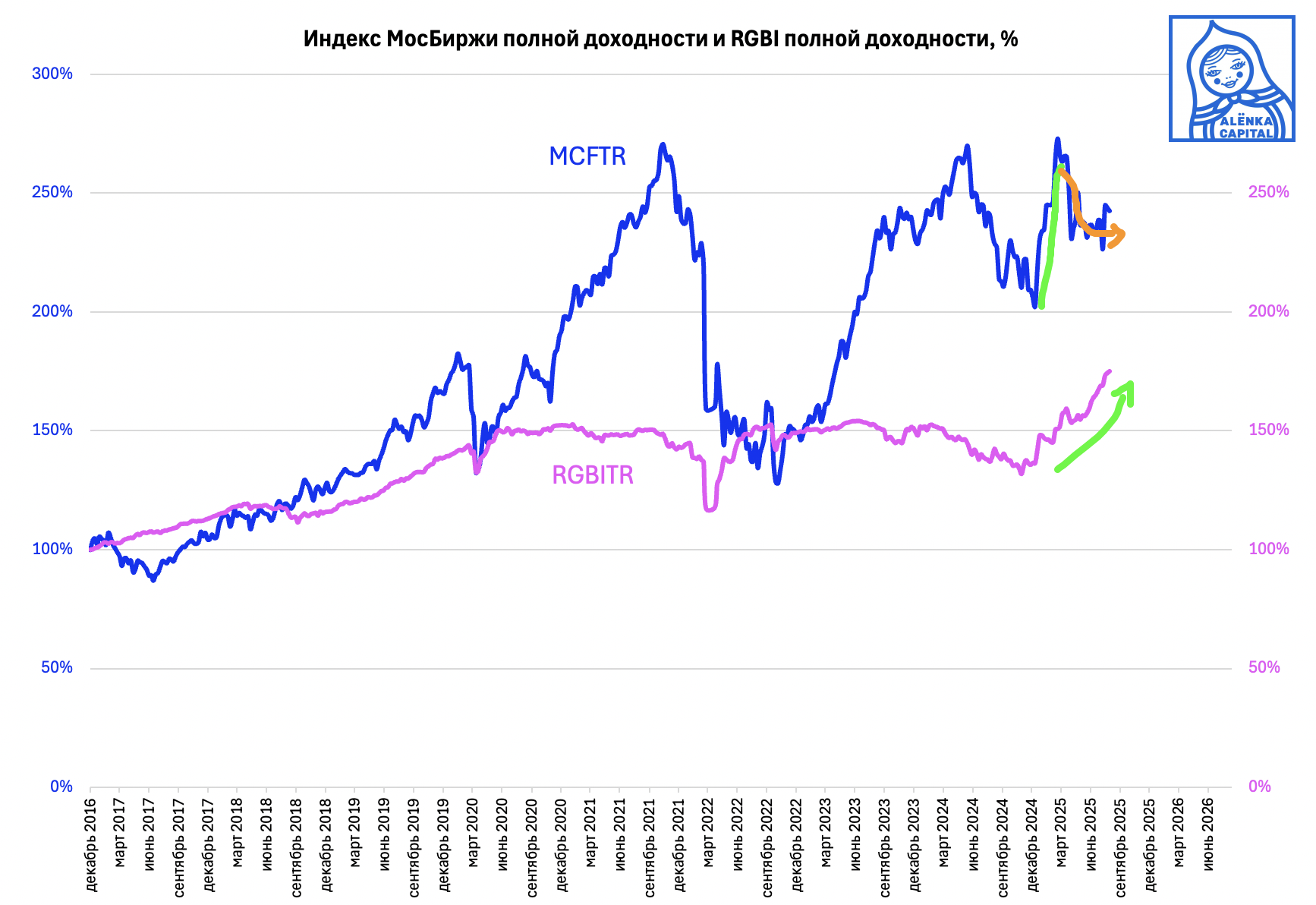 Задним числом можно было бы продать все акции в феврале 2025 и купить обратно облигации - тогда было бы ещё лучше.