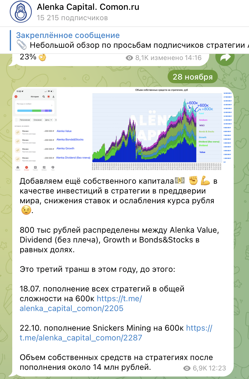 Добавили собственных средств на стратегии Alenka Value, Dividend (без плеча), Growth и Bonds&Stocks.