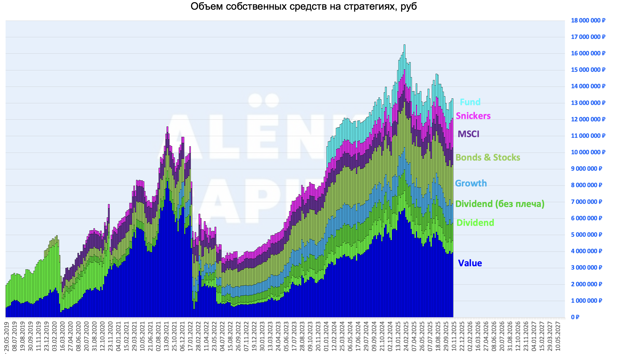 Всего на всех стратегиях сейчас 13 млн рублей, хотелось бы добраться до 30 млн рублей за счёт роста активов на новом цикле.